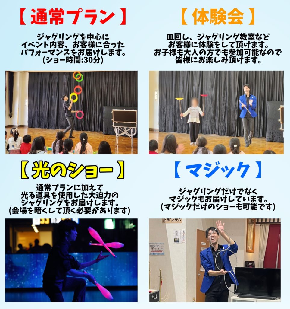 全国にジャグリングやマジックなどのステージショーを出張でお届けしているパフォーマーです!