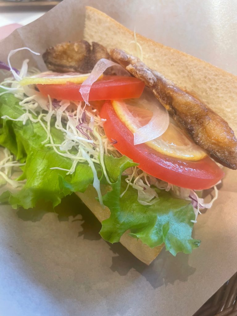 サバの竜田揚げ、レモンを味のメインに野菜もたくさん挟んだ長崎の新名物だそうです!
